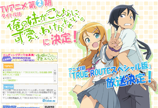 在四月初就宣布了即將製作二期的 TV 動畫《我的妹妹哪有這麼可愛!》,官方終於正式公開了播放的時期為 2013 年 4 月。而這消息是在 10 月 7 日(日)秋葉原 UDX 由電擊文庫舉辦的「秋の祭典2012」上的活動《我的妹妹哪有這麼可愛!》宣言會議上發表的。
